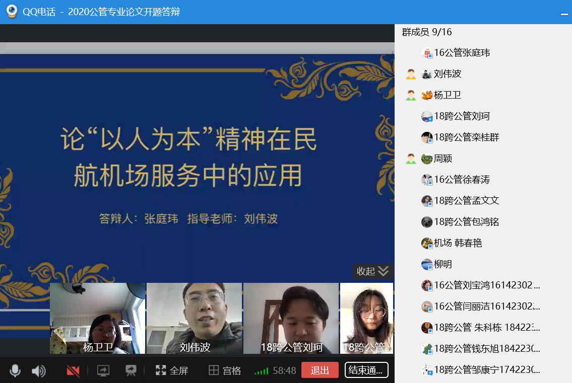根据学校防疫期间教学工作停课不停学的工作要求,以及《威廉希尔体育2020届毕业论文工作实施方案》,威廉希尔体育于3月4日至6日开展了2020届本科毕业生线上开题答辩工作。交通运输(机场运行与管理方向)、公共事业管理2个专业共109名毕业生分成7个答辩小组,通过QQ群视频或钉钉会议等进行了开题答辩。学院教学督导组主要成员加入各答辩群对答辩过程进行监控和督导。