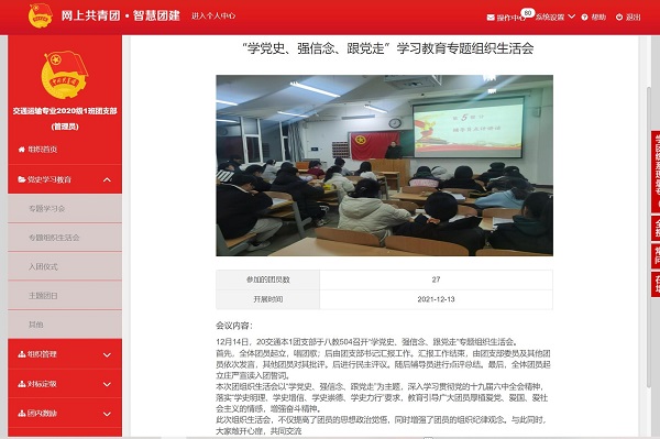 为引导广大青年团员深入学习贯彻党的十九届六中全会精神、习近平总书记“七一”重要讲话精神,贯彻落实“学史明理、学史增信、学史崇德、学史力行”要求,12月5日至17日,威廉希尔体育各团支部开展了“学党史、强信念、跟党走”专题组织生活会。