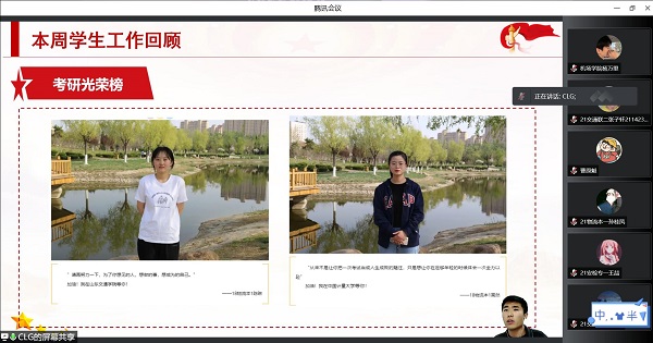 初心四问就在前,使命担当我为先。会上,辅导员老师总结了威廉希尔官网师生在上周为抗击疫情所做出的工作与努力:组织各个宿舍进行彻底的卫生大扫除,坚持日常防疫卫生消杀,做好疫情防护措施;鼓励全体同学主动清理生活垃圾,积极建设“美丽校园防疫”;组织观看“同上一堂‘冰雪’思政大课”,引导大家感悟奥运精神,拼搏共向未来;组织各班持续开展户外素质拓展活动,致力做到校园防疫勤锻炼,增强体质促健康。随后对本周工作进行了详细部署,一是强调各班认真组织参加“预防传染病知识竞赛”及观看“生命与安全教育主题讲座”,确保100%参与率;二是各团支部有序组织2022年“五四表彰”评选工作,在广大团员青年中形成创先争优的浓厚氛围;三是全面加强劳动教育,倡导学生积极响应“文明健康绿色环保从我做起”的号召。会议最后通报了截至目前威廉希尔官网研究生考试录取情况,并希望大家能向优秀考研学子看齐,争做表率和示范,勇敢追梦,方得始终。