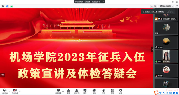 参军报国,不负韶华。为深入宣传国家征兵政策,扎实做好大学生征兵工作,进一步动员更多在校大学生参军入伍,激发广大学生参军报国热情,积极引导和鼓励大学生到军营建功立业。2023年1月26日上午十点,威廉希尔体育在线上召开2023年春季征兵入伍政策宣讲及体检答疑会,威廉希尔体育征兵联系人王珊珊,退役复学学生王超、张安琪以及已经报名参军和有意向参军的同学参会。
