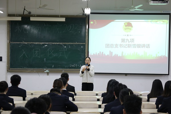 最后,靳雪银老师发表总结讲话,对新发展团员表示热烈祝贺,她强调,入团不仅仅是一种荣誉,更是一种责任,希望大家能够珍惜团员的身份,坚定理想信念,时刻牢记初心使命,发挥团员的先锋模范作用,坚定不移听党话跟党走,勇做担当民族复兴大任的时代新人。至此,全体起立齐唱嘹亮团歌,赤诚的歌声,诠释着团员青年立志报国的激情壮志,入团仪式在嘹亮的《光荣啊,中国共青团》团歌声中落下帷幕。