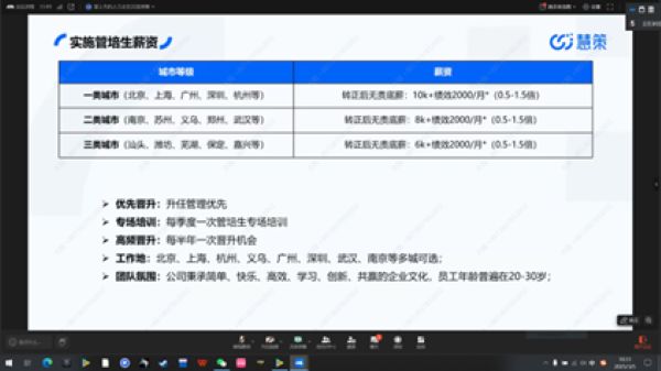 此次活动以视频会议的形式面向大家,向毕业生们展现了慧策集团迅猛的发展势头,以及其内部通畅的人才晋升通道。慧策的“鹰系列”培养计划是其人才发展的核心动力,这一基于岗位发展的人才培养体系,包含专业序列和管理序列的梯队建设,为不同发展路径的员工提供清晰成长规划,助力校招生在公司长远发展。此次校招岗位丰富,涉及产品、研发、销售、售后等多个领域。其中,销售管培生、实施管培生、软件售后技术支持(天津)、职能类(北京)等岗位需求较大。招聘流程包括宣讲会、网申/内推、笔试/测评、面试和发放Offer。慧策集团福利待遇优厚,提供无责底薪、补贴、高额提成/项目奖金以及六险一金,还有双休、法定节假日休息和带薪年假。想报名的同学可通过网申投递简历,网申地址为:https://huicecom.zhiye.com/Campus 。