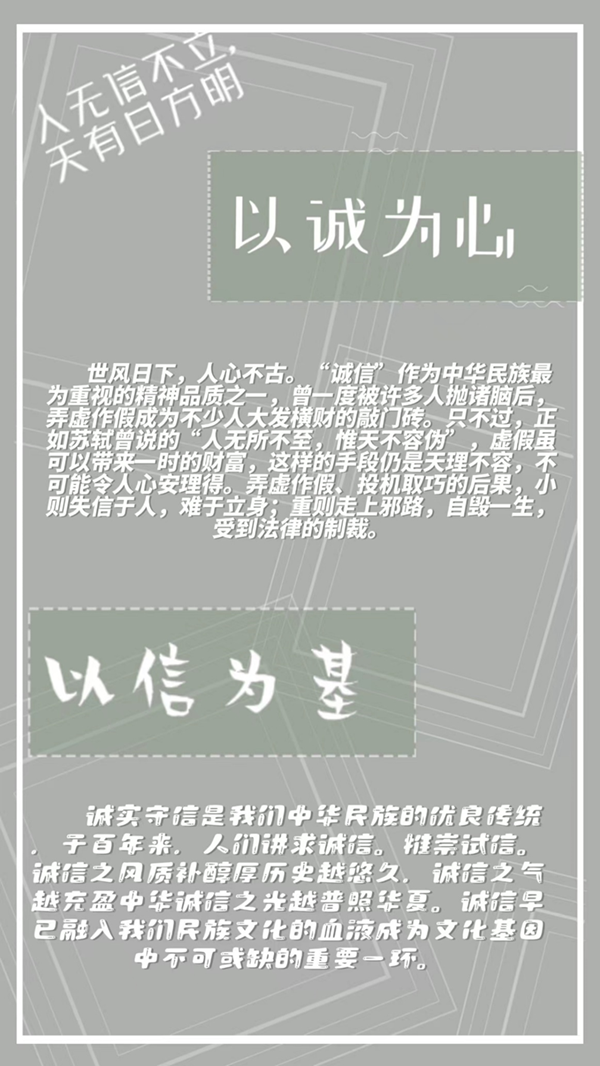 通过设计和展示海报,同学们加深了对诚信的理解,在日常生活中更加注重诚实守信。在活动的筹备和执行过程中,学生们积极合作,增进了同学之间的友谊,班级凝聚力得到了增强。活动提供了一个展示学生创意和艺术能力的舞台,激发了学生们的艺术兴趣和创新思维。